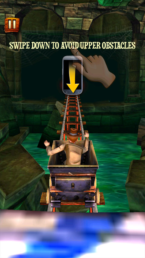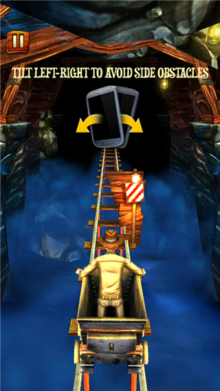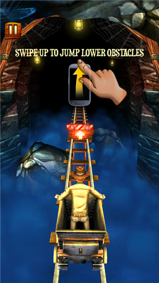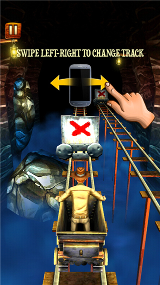 1、你乘坐着小矿车在轨道上奔跑,你能坚持多久?滑动你的手指,让小矿车跳动起来,并且收集更多的宝藏吧。