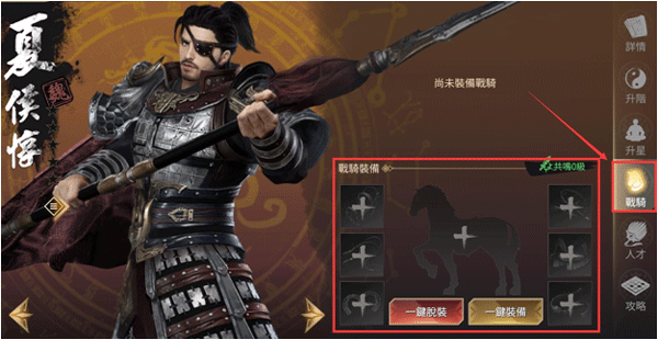 4、装备后,左边框会显示您已经装备完毕,在战骑的小图也可以看到什么武将正在使用这支「战骑」。