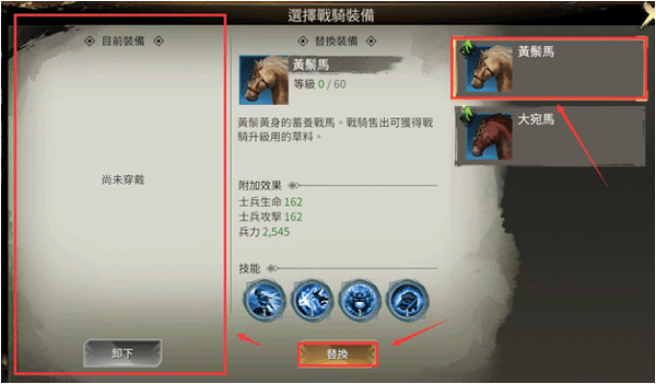 2、在右上方选择欲装备的战骑,确认后点击「替换」。