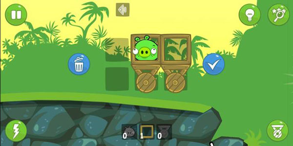 捣蛋猪是一款趣味十足的休闲益智游戏,画面精致细腻,拥有清新可爱的卡通形象,充满乐趣的关卡设置,适合各个年龄层的玩家,操作上没有什么难度很容易就可以上手,很适合在休闲的时候玩,有着超多的神秘关卡和地图等你来解锁。在游戏中,玩家需要帮助绿猪们建造各种各样的移动工具,让它们能够找到地图碎片、吃到蛋糕、收集星星等。如果载具上安装了气球,玩家就能控制气球爆掉的时机,以加速坠落速度或是调整方向;如果安装了电风扇和螺旋桨,就可以控制起落和漂浮的动作;如果安装了发动机或火箭,就可以加快行驶的速度。随着关卡的进行,捣蛋猪游戏提供的工具越来越多,组装的难度越来越大,因此每一关都要仔细考虑设备的组装方法才能通关,将你的创造力与想象力全开,才有可能完美通关,玩起来十分有趣。