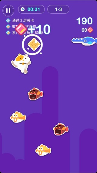 天天飞喵是一款休闲冒险类的闯关游戏,游戏的类似玩法与《笨鸟先飞》相差无几,但从该游戏的视觉画风和玩法的丰富性上,相比《笨鸟先飞》有着更加出色的表现。在游戏中玩家需通过简单的点击屏幕控制小猫的上下跳动,在躲避沿途障碍、飞鱼的过程中,收集饼干或捕捉关卡目标下的鱼类数量,有趣的一点就是游戏关卡内的鱼类种类有着不同的特性,例如小电鱼,在被捕捉时会紧张过度发出一条电流,导致其他小鱼也被捕捉,其他的还有电鳗,间歇性全身放电,放电后无害,类似的鱼类特点还有很多。当然除了以上涉及到的这些玩法外,在天天飞喵游戏中支持小孩模式,并在小孩模式下进行游戏,没有广告,没有内购,放心交给小孩子玩!还孩子一个干净的游戏环境!