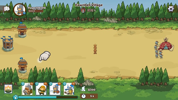 成功进入关卡后,在界面的左侧下方,分别是你可用的队伍,蓝色条能是你的能量,不同队伍的招募需要对应的能量才能进行,比如炮兵需要4格、弓箭手需要3格、地雷需要2格、骑兵需要3格,后续玩家还能解锁更多兵种。关于放置,只要满足一定的能量后,拖动屏幕上的兵种到战场上即可。