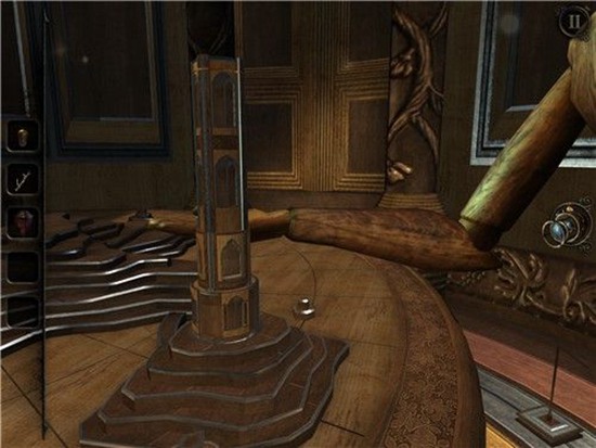 本处需要多次转动沙盘下方的把手,依次把木偶人的双手和脚拼上,每装上一个部件,就会触发一次沙盘上的建筑物机关,需要用透视镜进入该机关。