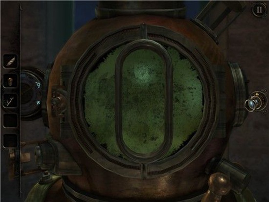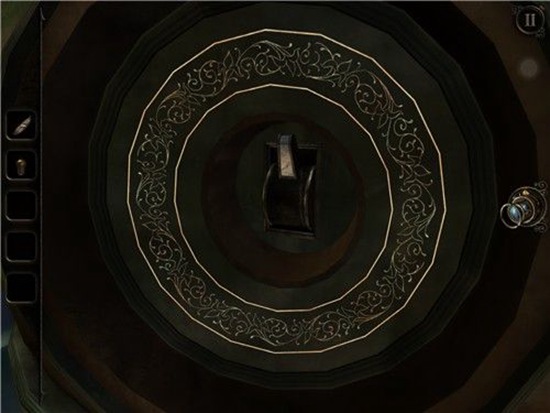 退回到房间里,发现沙盘后面的桌子上有一个头盔形状物体,仔细观察发现左下有一处按钮,有明显划痕,把X和方块扭到对应位置,即可打开头盔铭牌下的机关,得到一个黄铜铆钉。