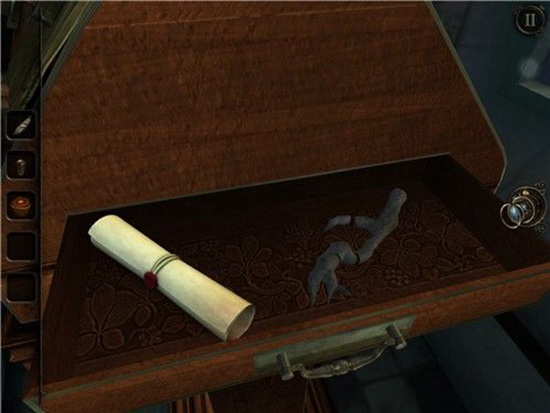退回,圆桌上有个抽屉,打开(注意要用两只手哦)。一块齿轮型木块,拿起收好(手速慢了,没截到图,抱歉~~~)。