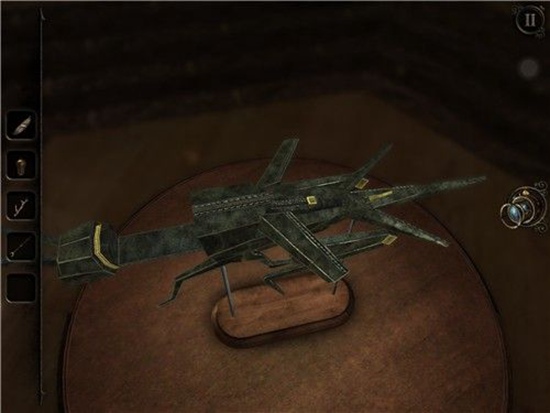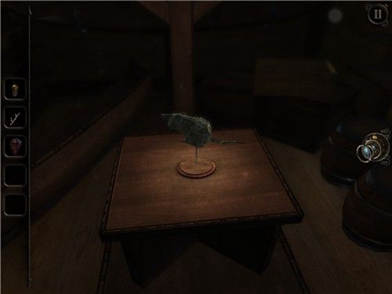 里面是一个机关猫头鹰,把鼻子往上提,转动头部,胸部一侧会打开,沿着轨道拉动机关,翅膀会打开,拿到小船。退回沙盘。