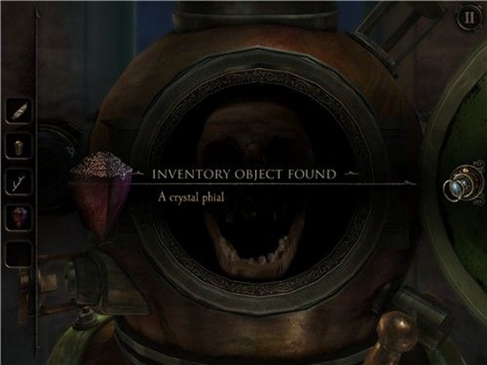 拧开螺丝后,发现头盔里竟然有一个骷髅头(国服和谐了),从骷髅头中得到一个水晶玻璃瓶。