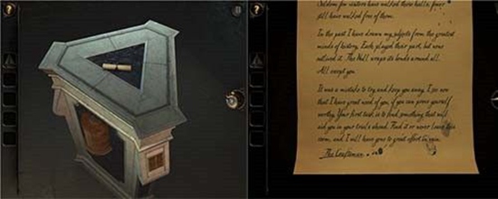 来到头盔右边,抽屉里发现一封信和一个鹿角。
