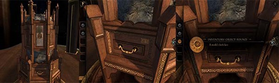 小塔的这面(如图)有个抽屉,打开得到一个钟面,拿起收好,退回沙盘。