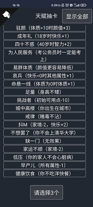 1、下载安装本站提供的人生重开模拟器,进入之后玩家需要选择3个喜欢的天赋;