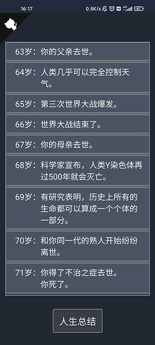 5、点开总结的话,玩家可以看到自己的一生是如何度过的,非常有意思。