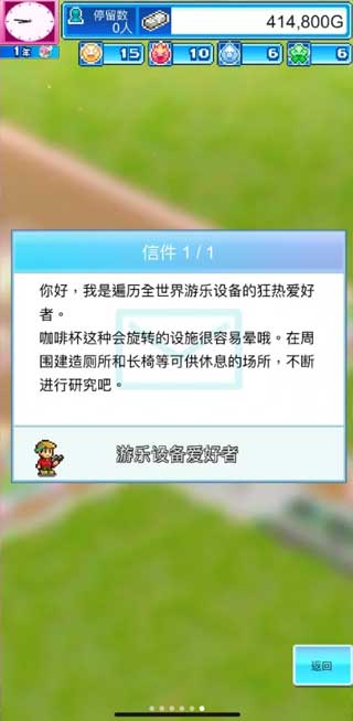 5、玩家搭建好游乐园之后,随着你的游客人群越来越多,有时就会有出名的游乐设备爱好者给你写信提供建议,你只要根据提示来操作即可。