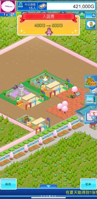 1、首先建造“咖啡杯”和“蹦床”等游乐设备迎来游客,还可以选拔并培养人气吉祥物,让他们在游行中出场。