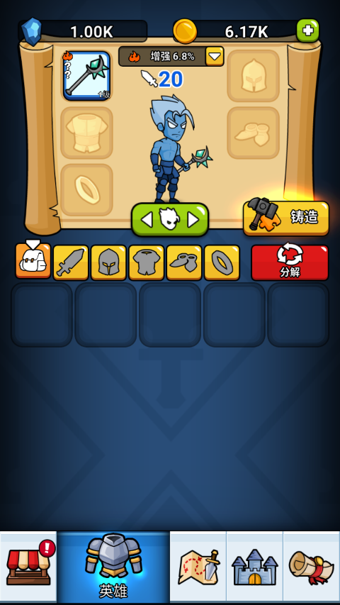 2、打造你强大的英雄,提升他的能力,升级他的武器;