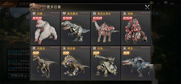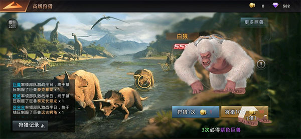 这里说的高级狩猎的狩猎地址就是龙鳞岛了,龙陵岛的恐龙资源是非常多的,只有在这个岛上,小伙伴们才能够捕捉到ssr级别的恐龙,比如说白元和暴龙这两个恐龙,她们的攻击力属性都是非常之高的,是小伙伴们都想获得的恐龙之一,除此之外,这个岛上的sr级别的恐龙也是非常不错的,例如迅猛龙和巨龟都是小伙伴们在中期战斗过程中能够扛住队伍大旗的角色之一,感兴趣的小伙伴就快来龙鳞岛上试一试手气吧!