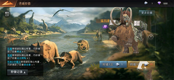 巨兽战场中的恐龙对于小伙伴们来说是非常重要的一个角色,因为恐龙的战斗力决定着玩家的整体实力,而获取恐龙的最主要的途径,就是通过狩猎中心这个建筑了,小伙伴们可以在这个建筑中进行捕猎。