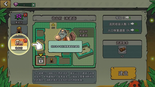 针对建造资源的要求也在这里可以体现!升级收容所可以提升流民收容人数和人口恢复速度!