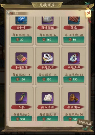 客栈商店兑换必先门客残帖,然后根据情况兑换其他资源。前四个每天至少兑换一次,第一次性价比最高,第二次如果稀缺材料的话还可以再兑换一次,第三次兑换就会很亏。没有交子就去宴会商店或者商会买食材烹饪。至于开山碎片什么的,交子多的话可以每天各兑换一个。慢慢攒,这是个长久的过程。