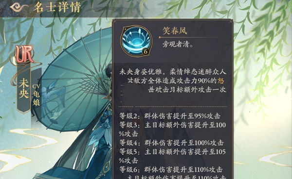 笑春风(大招技能):未央开启大招后可以对敌人群体单位造成少量的伤害,并对主要目标再额外造成一次伤害。