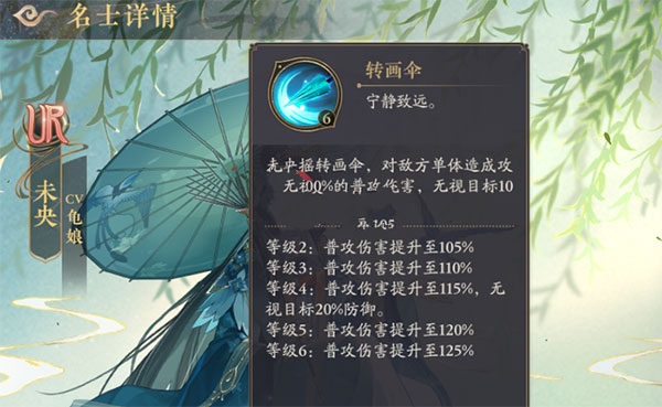 转画伞(普通攻击):未央用画伞攻击,造成普攻伤害时会无视目标10%的防御(随着练度的提升,她的普攻伤害会不断的提升)