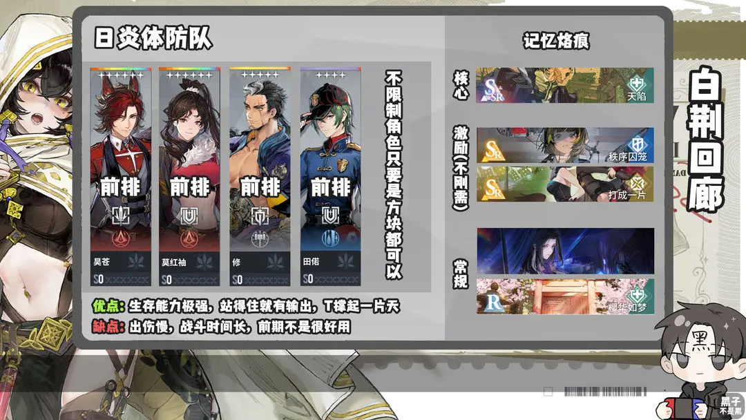 日炎队可以不用着重考虑激励,根据队伍组成的角色灵活佩戴激励烙痕即可,例如屏障水核炎暗巷漆影。日炎需要更多的考虑增加队伍坦度。除开核心烙痕天陷,日炎队还需要佩戴ssr烙痕幕影重重r烙痕樱花如梦去提升角色坦度,其余烙痕也更多选择体质烙痕。