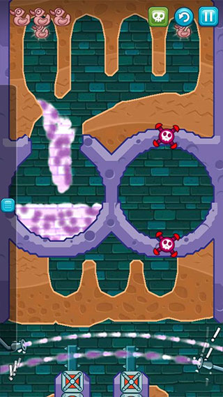 3、值得一提的是,游戏中还会出现一些绿色水草,水草遇到水就会猛长,最后堵塞导管,这时候就要毒水就可以派上用场了,可以用毒水破坏水草,再流入清水。游戏画面轻松可爱,关卡的设计也很丰富,极富挑战性,拥有视网膜显示图像,多点触控及出色的音质效果。