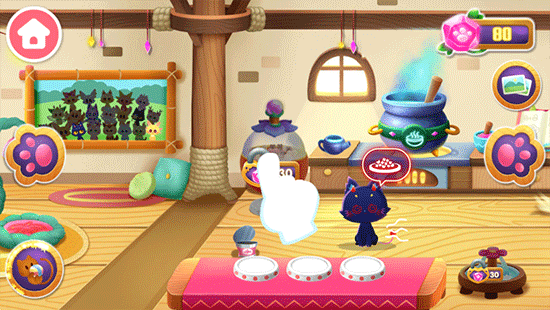 拿到食物的小猫,要从空中掉下来啦!宝宝快秀出快速反应:拖动蹦床,快速接住;再让小猫借力蹦床,安全起跳。甜甜圈、鲷鱼烧……哇,多亏了宝宝的助力,小猫拿到了好多食物!