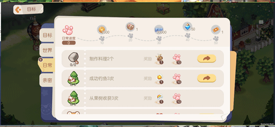 在主界面头像下方,可以看到【目标】,找到第三行的【日常】,就可以看到目前的日常进度啦。当日常任务进度达到60时即可领取大量经验(获取量随等级增长),同时也可以积攒很多材料,装扮家园什么的就有基础啦,可谓佛系玩家福音~