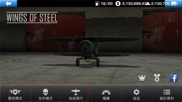 1、首先打开钢铁之翼苹果版,点击进入游戏可以看到三种模式:战役模式、生存和自由飞行,点击机库可以更换飞机;