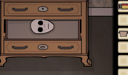 过去:输入排风扇上的时间场景发生变化,Albert的遗像摔在地上拿里面的钥匙开抽屉获得面具,在镜子前戴上面具,将墙壁上的图案顺序告知未来