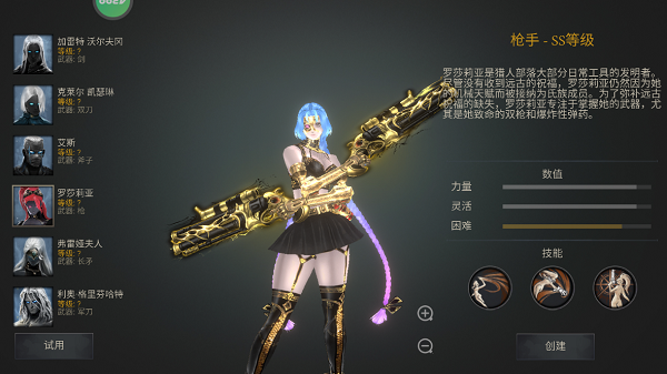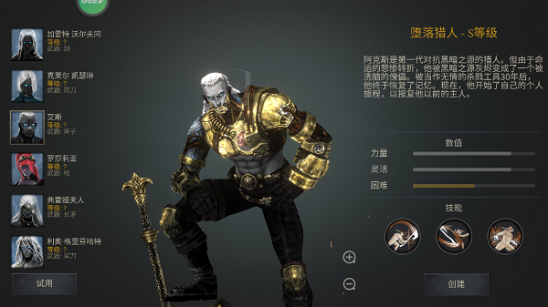 1、打开暗影猎手失落的世界,我们进入游戏后,需要创建英雄;(只能选择第一个哦~其他的英雄都需要通过一定的关卡才能解锁)
