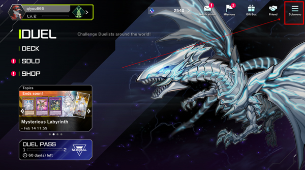 1、打开游戏王大师决斗,进入游戏之后点击右上角Submenu;