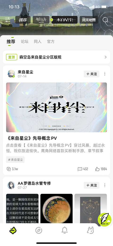 4、如图进入到应用界面,可看到上方包括推荐、明日方舟、来自星辰等版区,