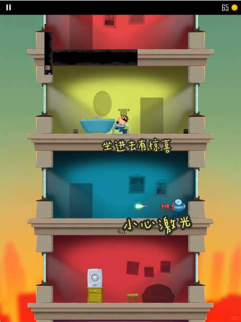 3、玩家跳到浴缸中就能下落好几曾楼房,并且在下来的过程中小心激光扫射。