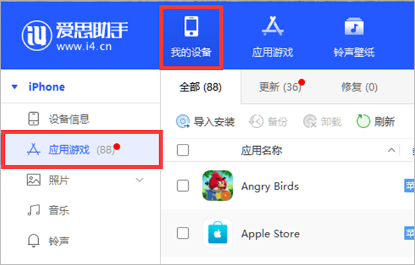 第六步、保证手机正常连接爱思助手,随后在爱思助手顶部导航栏处选择“我的设备”,并在左边菜单栏中选择“应用游戏”,即可展现当前手机所安装的应用游戏列表。