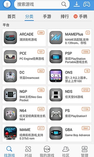 完美模拟街机(fba\mame\mameplus)、PS、PSP、FC(NES) SFC(SNES)、GBA、GBC、MD、NDS、DC、NGP、WS(WSC)PCE、ONS等18款经典游戏机,持续加入中…