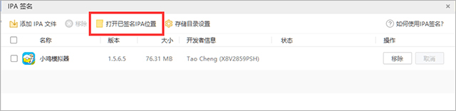 第五步、待签名完成后,则可点击左上方的“打开已签名IPA位置”,找到完成签名的IPA文件。