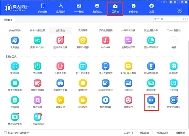 第一步、下载安装爱思助手,打开爱思助手并点击顶部导航的“工具箱”按钮,随后在工具箱页面下方点击IPA签名按钮。