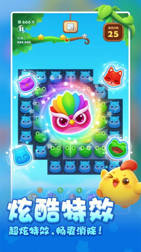 滑动手指让三个及以上的同色小动物横竖相连即可消除,完成每关的指定消除目标即可过关!