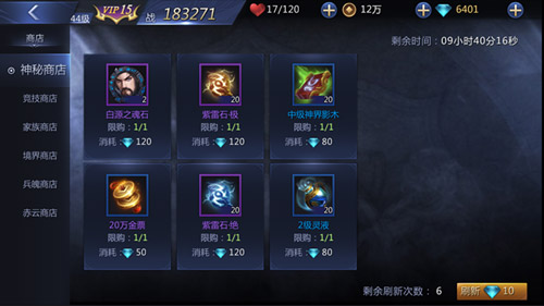 然后就是商店系统了,在这里面,能够兑换金币的是神秘商店和境界商店,分布消耗的是神晶和夏族贡献值,其中,神秘商店可以通过刷新来重置次数,不过也是要消耗神晶的哦!而境界商店则没有限制,只要你贡献值够,就可以兑换!