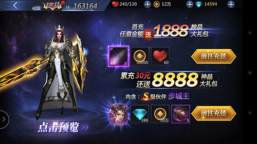 2、再来就是首充礼包啦,充值30元就能获得A级伙伴步城主,步城主是强力的MT,而且输也不俗,大招还有眩晕和沉默的效果,简直是杀人越备 装逼泡妞必备伙伴啊!