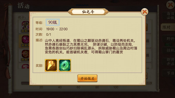 仙之斗作为蜀山战纪游戏中一个非常不错的活动副本,在每天晚上19:00至22:00时间段内开启。