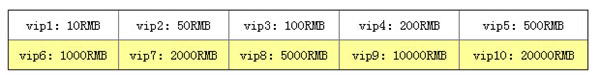 从上图可以明确的看出各个vip阶段需要充值金额,但是需要注意表上的充值是累计金额,例如你是vip1,想到vip2只需充值中间的40差价即可。