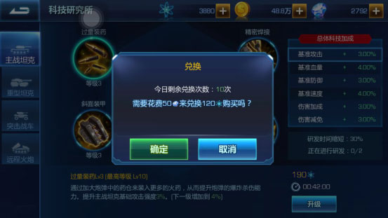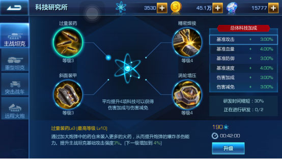 第三:科技研发。科技研发也能提升坦克的各种属性,但是按照相同的升级速度来提升各项,会增加伤害还伤害免疫,所以不要一直只升级一种,要根据情况全面升级。