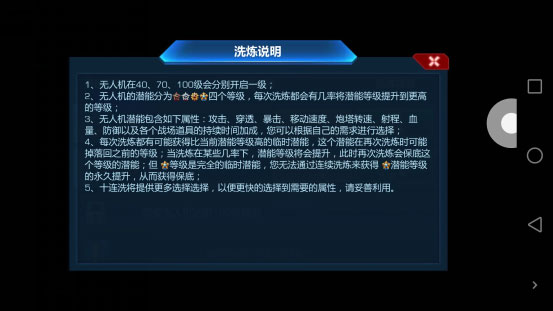 第六:坦克部件的升级顺序和无人机的强化洗练。对于坦克部件的升级顺序,个人推荐从攻击到装甲到移动速度,当然对自己操作满意的可以先升级移动速度通过移动来躲避炮弹,对于新手不比较推荐,每个无人机都有自己的技能和潜能,根据你主升的坦克来进行选择,潜能需要无人机达到一定等级后才能解锁,解锁后就可以选择你最想要的能力进行洗练,洗练说明见下。