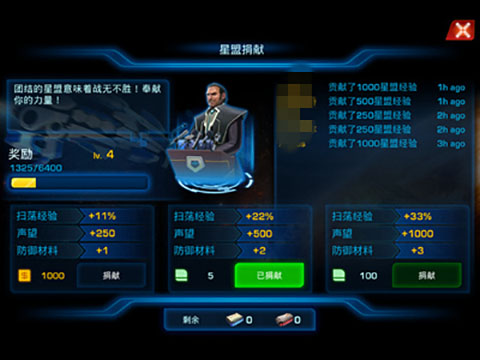每天每个星盟成员可以向星盟进行捐献,捐献分为三个等级,第一等级捐献1000星币、第二等级捐献5点信用点、第三等级捐献100点信用点。根据你捐献的等级不同,你可以获得的buff加成也不同,Buff加成分为扫荡经验加成、声望加成、防御材料加成。捐献等级越高,加成越高!