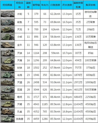 表格中给我们显示了坦克价格、升级费用、以及满级属性,总得来说,先升级弱项,依次把它们升满级,装甲升到影响行驶速度就暂停,最后根据需要再升。