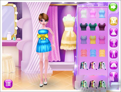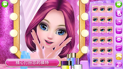在化妆间内,右侧边栏为装饰栏,可选择各类服饰给可可穿,点击绿色箭头可继续妆扮发型、五官和饰品。400件时尚服饰,再到200多款发型、五颜六色的唇彩、睫毛、色彩鲜丽的眼影、别致的眉毛、各式美瞳、粉底等任君挑选。