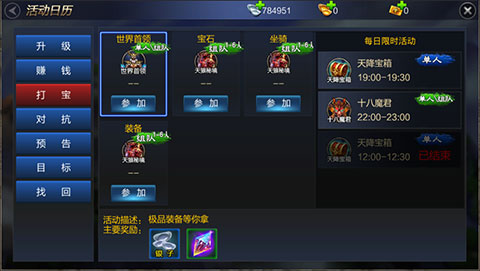 参与方式:点击屏幕上方“活动” 按钮后,通过活动面板进入副本。