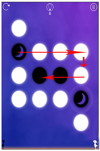 虽然人设风格类似,但《同一个世界》却不是如大家所猜想的解谜冒险游戏,而是益智~玩家所要做的就是将画面的黑白光圈归于同一种类型,如此便可让男女主角跨过界限再次相见。带有月亮的光圈是我们开始的地方,连接上下左右方向的光圈就可以改变它们现有的颜色,当屏幕上所有的都变为同一种颜色,无论是黑还是白都意味着同一个世界的产生,这或许就是本作定名的意义吧。